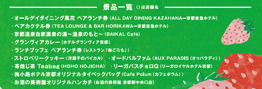 - 押印はお会計時に店舗スタッフより対応させていただきます。 - 押印対象商品は、いちご博覧会に掲載している商品のみです。 - お一人様1商品のお会計に対して、1つスタンプを押印します。 ※例)3名で来店し1商品のみご注文された場合に、3名(枚)分押印することは出来かねます。 - 賞品の内容は一例です。予告なく変更する場合があります。 - 複数枚の応募を通してご参加された場合でも、賞品当選確率は上がりますが、当選は1回とさせていただきます。 - 景品は事務局にて選定するため、ご希望に添えない可能性がある点、ご了承願います。 - 複製したスタンプ台紙、個人で押印したスタンプ等、不正行為が見受けられる場合は、当選対象外とします。 - 当選発表は商品の発送をもって替えさせていただきます。